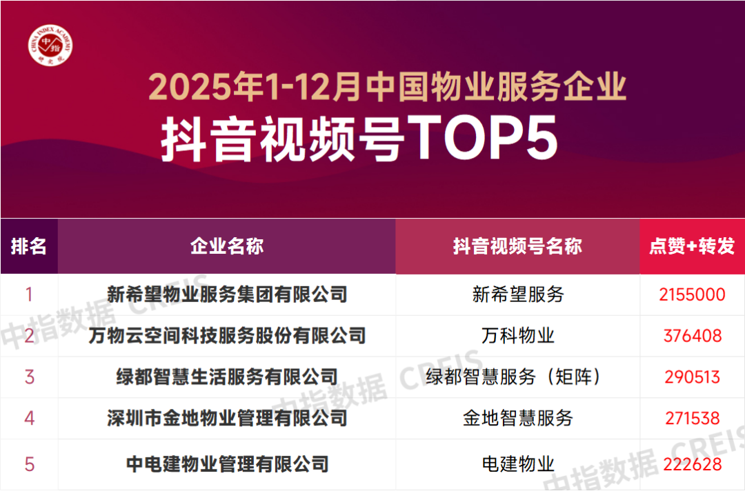 2025年1-12月,5家物业服务企业抖音视频号点赞量和转发量共计331.6万次,新希望服务尤其突出,抖音视频号点赞量和转发量超215万次。