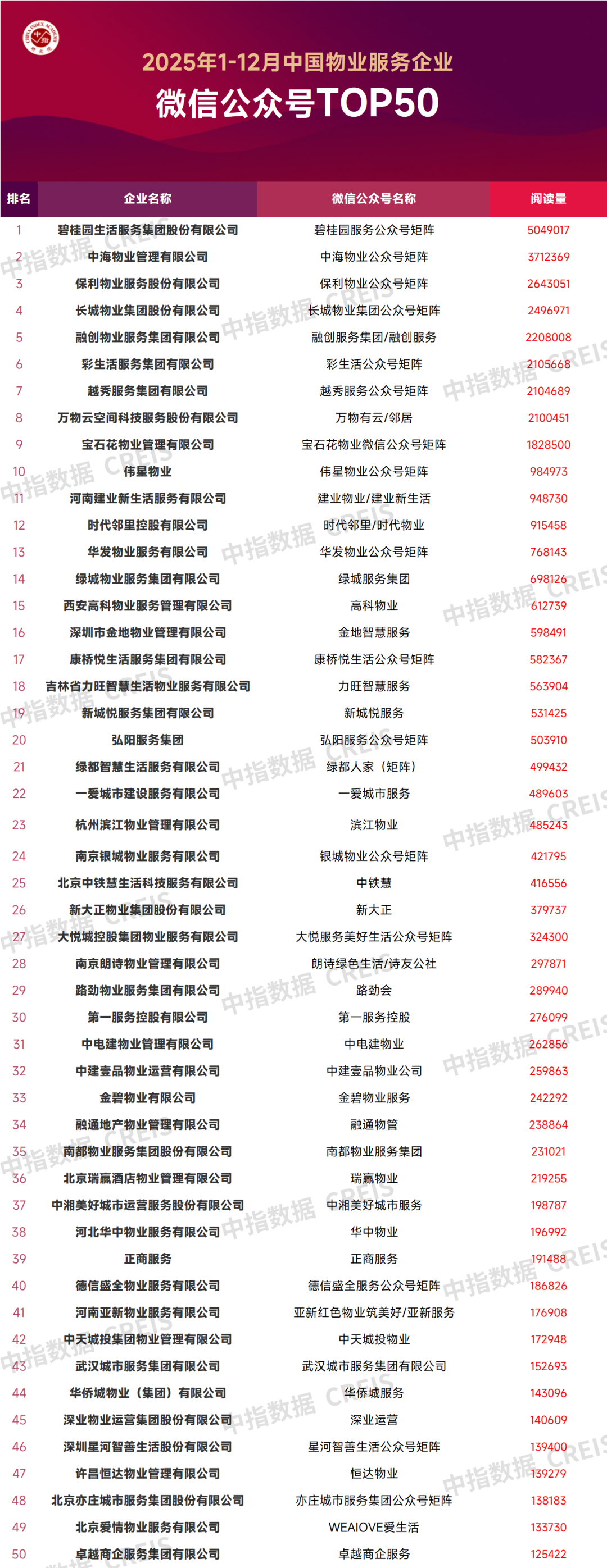 数据说明:以2025年1-12月为统计范畴,对中国优秀物业服务企业的微信公众号阅读量合计进行统计。本榜单仅供参考,课题组不对使用报告及其内容所引发的任何直接或间接损失承担责任。